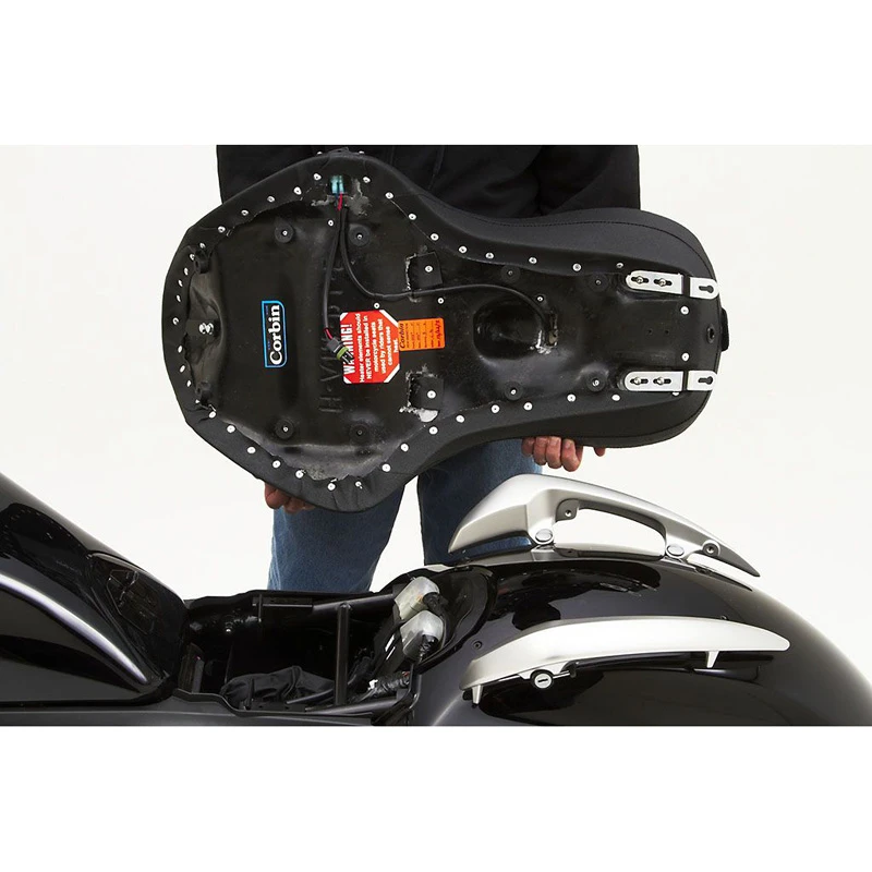 - Corbin’s Dual Touring saddle installs easily with a tongue in the front and two bolts into your fender at the rear using stock locations. If you opt for electric heat, we include a wiring pigtail to integrate with the factory fusebox and all other components will be preinstalled in the saddle.