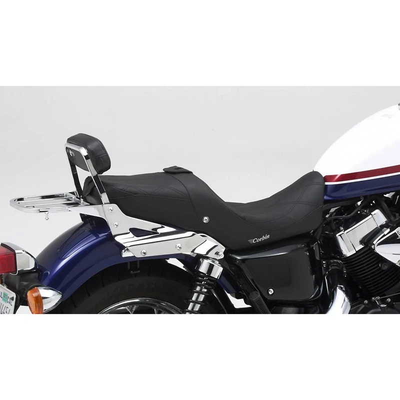 - Corbin’s Dual Tour saddle shown with model #02-SB backrest and Honda sissy bar.