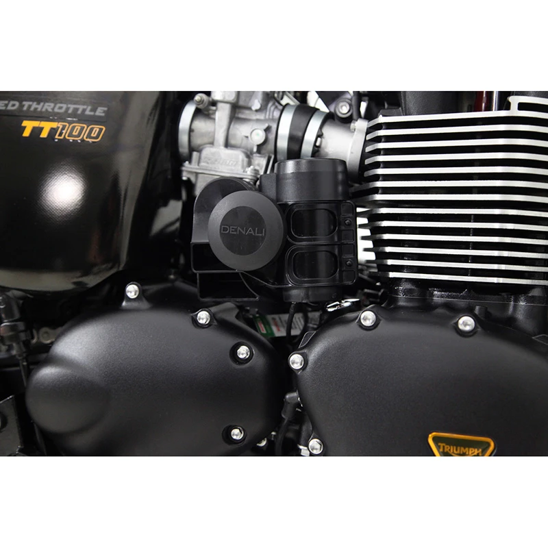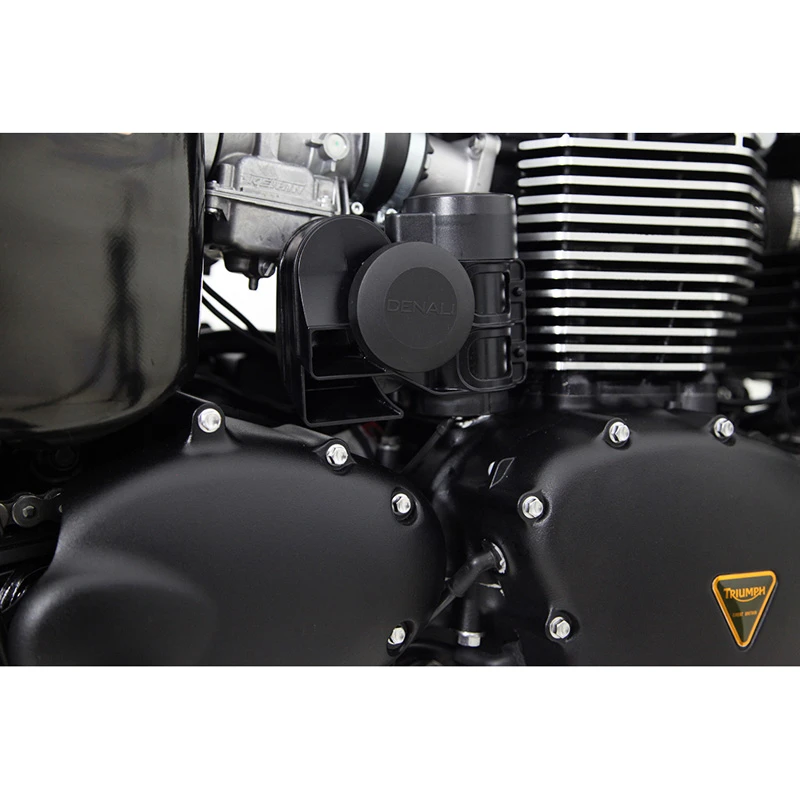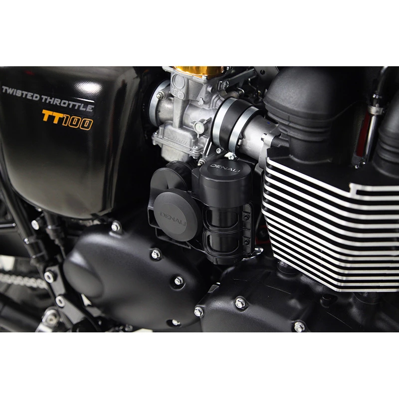 Bike-specific mount kit for installing Denali SoundBomb or Stebel on a Triumph Bonneville & Thruxton ’04-’16. All mounting hardware and instructions included. For easy wiring, check out our Plug-n-Play wiring kit.