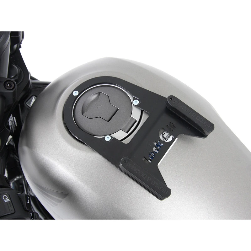 This mount contours to the tank and provides a mounting location for any Hepco & Becker tank bag without interfering with the handlebar.