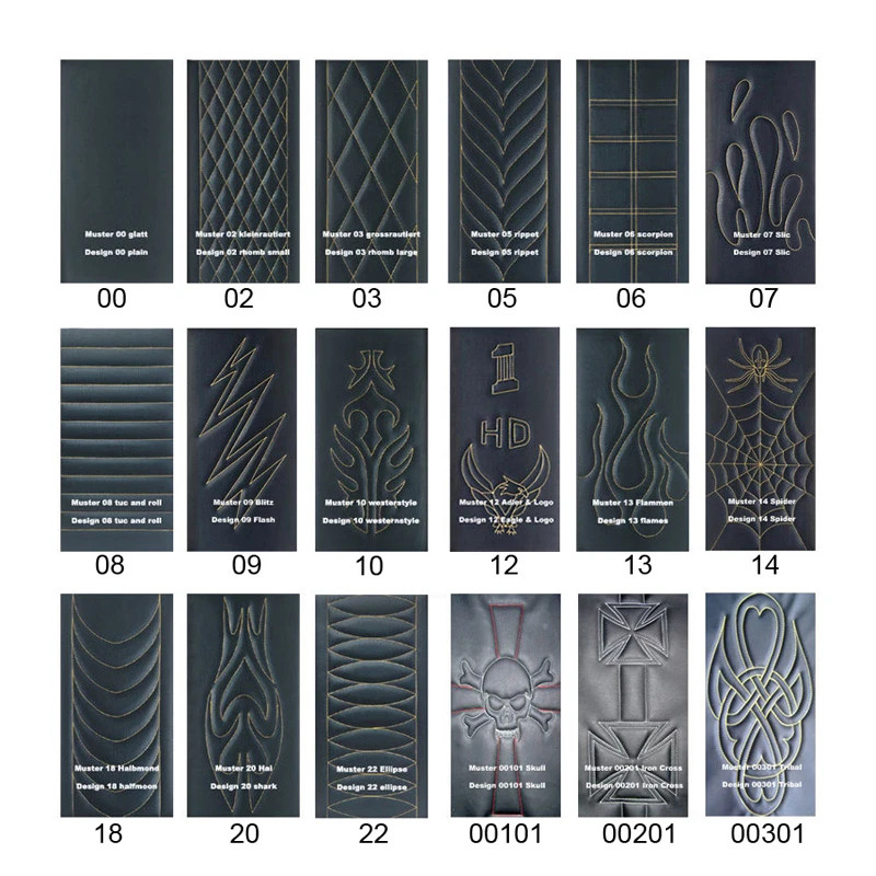 | Seat Designs | 00 Smooth, 02 Small Diamonds, 03 Big Diamonds, 05 Rippet, 06 Scorpion, 07 Slic, 08 Tuc and Roll, 09 Lightning, 10 Westernstyle, 12 Eagle and Logo, 13 Flames, 14 Spider, 18 Crescent, 20 Sai, 22 Ellipse, 00101 Skull, 00201 Iron Cross, 00301 Tribal |