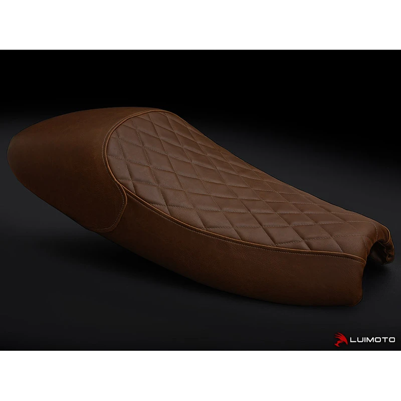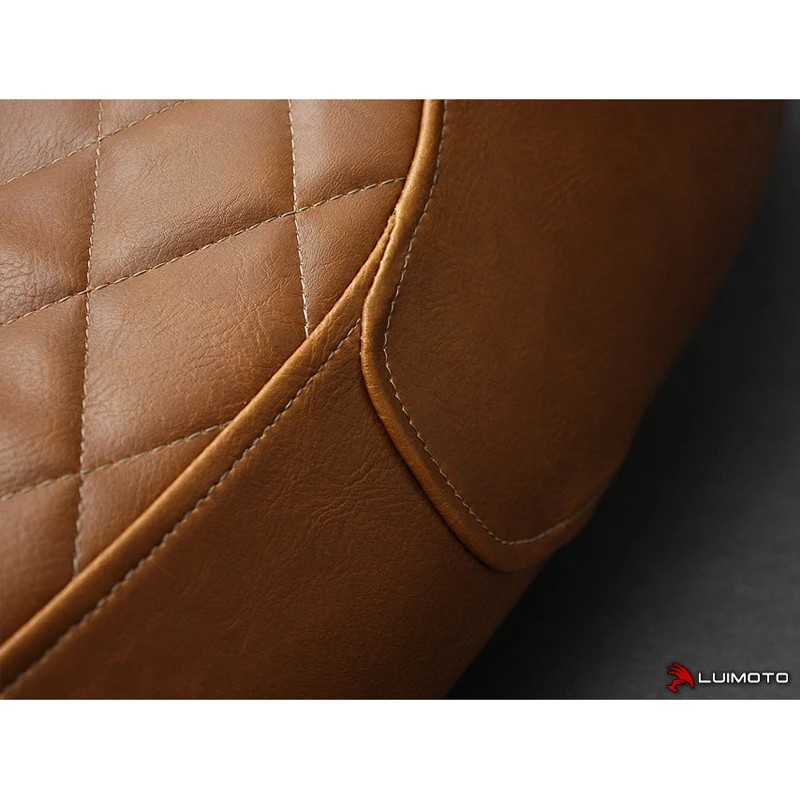 Introducing the Luimoto Sixty 8 Vintage seat cover. It uses our latest vintage style fabric available in brown, and black. This leather look material features signs of distress, stitched in a diamond quilt, and a custom pattern offering a unique seat cowl look. All of this combined really brings out the modern classic look.