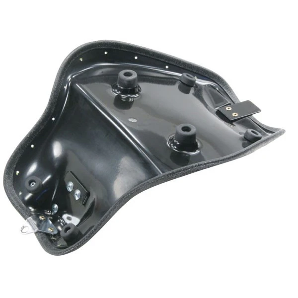 The edges of all baseplates have a steel reinforced, impact absorbing vinyl edge trim to protect the seat cover. Polyurethane bumpers are strategically located and riveted to the baseplate to prevent it from touching the frame and fender and to minimize vibration. Mustang’s unique internal support wings are added to the baseplate to provide maximum driver and passenger comfort. These wings support the entire width of the molded foam. This feature is found on most Mustang touring seats. Bumpers will not crack with age and are ozone protected. Solos with built-in driver backrests have the receiver welded and reinforced to the baseplate for strength. Foam surrounds the hardware to provide maximum comfort.