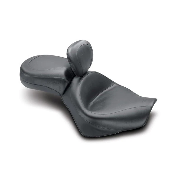 Sold as a complete three-piece set including solo, removable driver backrest, and matching passenger seat. The built-in driver backrest offers more features than any other backrest on the market. Mustang’s two-piece touring seats are available with a deep front bucket which measures a full 17″ wide. The passenger seat extends forward to provide ample back support for the driver. The rear seat is 12.5″ wide and features Mustang’s unique internal steel support wings to keep the entire width of the molded foam supported.
