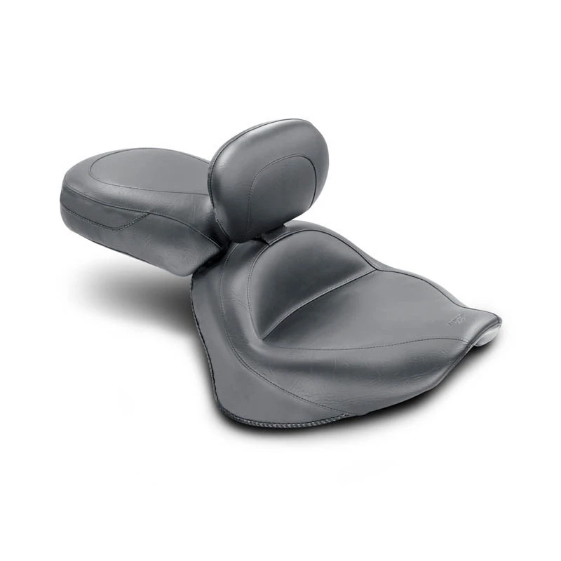 Sold as a complete three-piece set including solo, removable driver backrest, and matching passenger seat. The 17″ wide driver bucket sits you at the ideal cruising angle and is one of several design improvements over the stock seat. The entire 12″ width of the comfortable passenger seat is fully supported by Mustang’s unique internal steel support wings–no sagging on the edges, no more passenger complaints. The built-in driver backrest offers more features than any other backrest on the market.