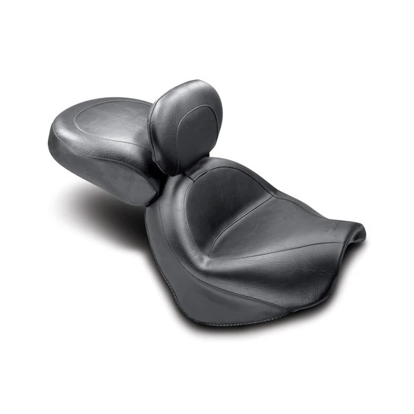 Mustang’s popular touring seat features several design improvements over the stock seat. The 16″ wide deeply pocketed driver bucket sits you at the ideal cruising angle. The entire 12″ width of the comfortable passenger seat is fully supported by Mustang’s unique internal steel support wings–no sagging on the edges, no more passenger complaints. Sold as a complete three-piece set including solo, removable driver backrest and matching passenger seat. The built-in driver backrest offers more features than any other backrest on the market. Will not work with trike conversion.
