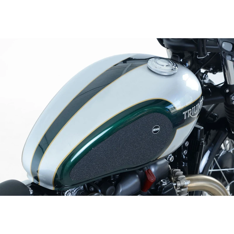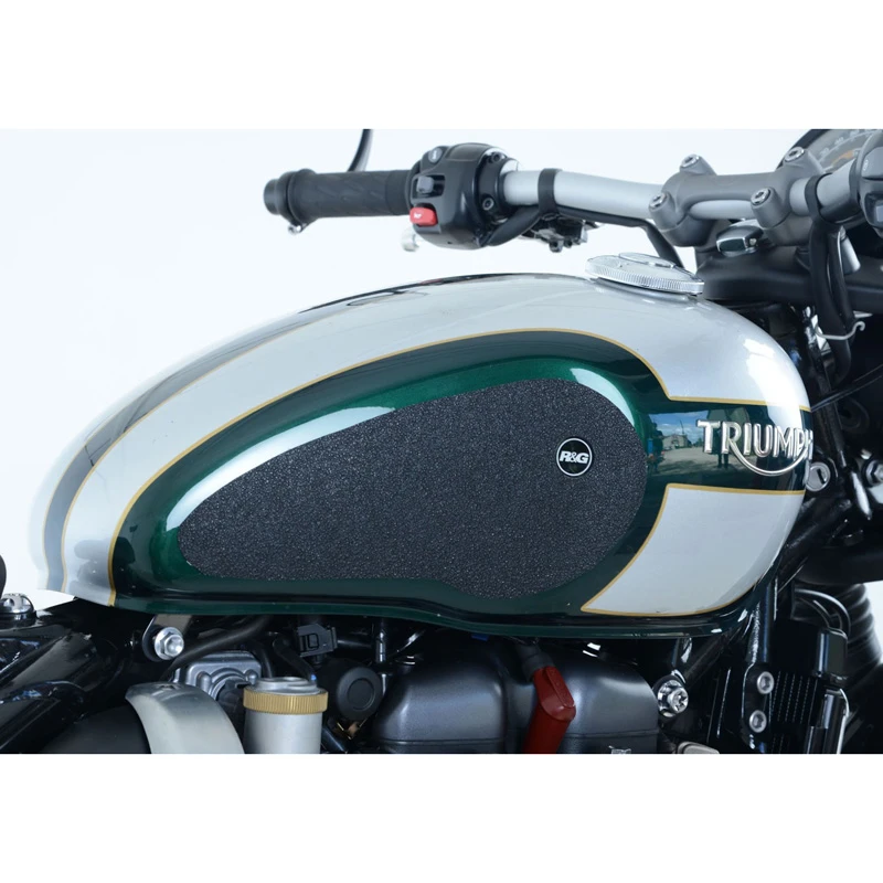 The R&G tank traction grips for Triumph Bonneville Bobber | 2 Piece provide an enhanced connection to the motorcycle with more accurate body position control. Low profile synthetic rubber pads are precision cut for an exact fit that integrates perfectly with the design and shapes of the bodywork. These beneficial grips will keep you planted during hard braking, acceleration and cornering so your focus can be placed on the road ahead without having to compensate from sliding on the fuel tank. Reduced pressure on the hands, wrists and arms is achieved as the pads provide proper support of your upper body resulting in added comfort. The most exciting benefit of these grips is that handlebar inputs can be made more precisely so overall handling feels significantly improved. A self-adhesive backing makes installation very simple with no permanent modifications needed.